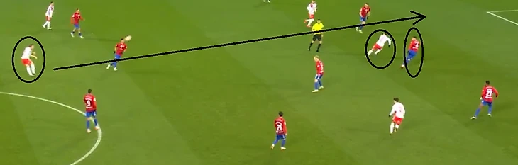 Первый по-настоящему опасный эпизод случился уже на 3 минуте:передача верхом от Умярова в сторону Угальде, который почти добрался до мяча.Не хватило буквально мгновения.
