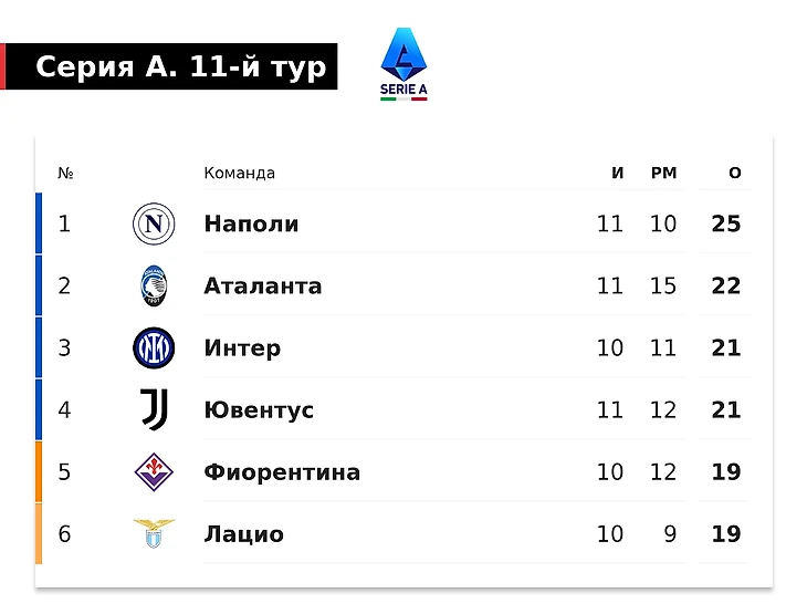 Команда Антонио Конте сохранила первое место в таблице, но «Аталанта» подобралась на расстояние одной победы. А «Интер», если в этом туре обыграет «Венецию», приблизится к неаполитанцам вплотную.