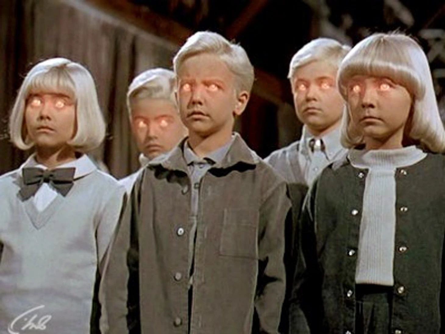 Как и в случае с фильмом «День независимости», который мы вспоминали в самом начале поста, здесь также не обошлось без инопланетного вмешательства: американскую деревню Мидвич посещают инопланетяне. Под их воздействием жители деревни внезапно впадают в сон, который длится 6 часов. Позднее кажется, что 10 девушек беременеют, причем она из них – девственница, тогда как мужья остальных давно уехали из Мидвича. Доктор, который их обследует, хочет написать научную работу по этим событиям, поэтому за деньги уговаривает женщин сохранить беременность. В итоге рождаются дети-близнецы, которых от обычных детей отличают бледная кожа, глубокий взгляд, отсутствие эмоций и умение читать мысли и гипнотизировать людей.