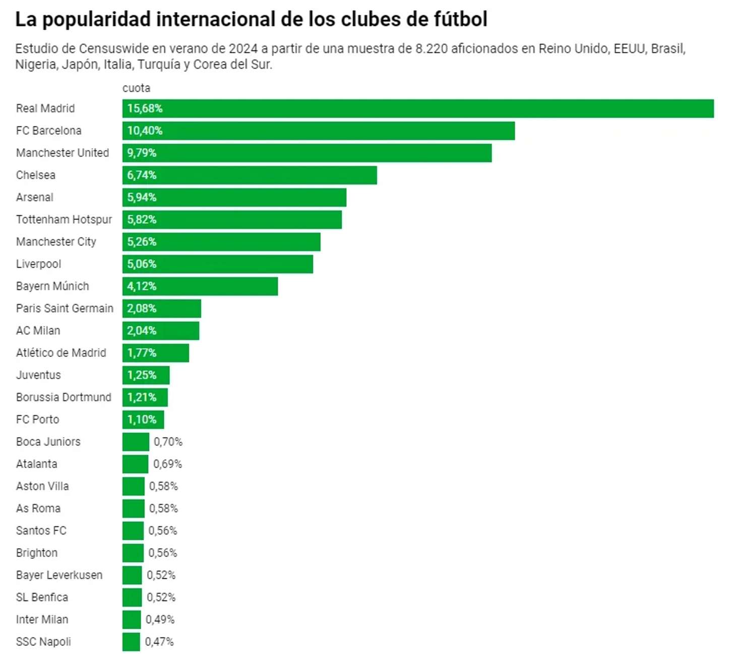Этим летом исследовательский центр Censuswide провел опрос о самых поддерживаемых клуба в мире. В анализе поучаствовали 8,2 тысячи болельщиков из таких стран как Великобритания, США, Бразилия, Нигерия, Япония, Италия, Турция и Южная Корея.