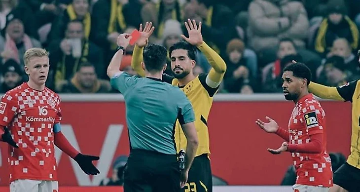 План хозяев на игру сработал с самого начала, поскольку «Боруссия», хотя и контролировала игру, но ничего не могла поделать с глубоко эшелонированной обороной «Майнца». А если линия прессинга переигрывалась гостями, то «карнавальщики» за счет лучшей физической готовности успевали быстро откатываться назад, и заставляли соперника постоянно бороться за мяч и за позицию и тратить свои драгоценные силы. Это привело к тому, что уже к середине первого тайма характер игры начал меняться. А на 27-й минуте Джан недалеко от своей штрафной очень грубо и опасно сыграл против Ли Джэ Сона, и главный арбитр матча Флориан Бадштюбнер без колебаний показал капитану красную карточку. Уже в 3-й раз в этом сезоне дортмундцы остались вдесятером. И все три раза в гостевых матчах.