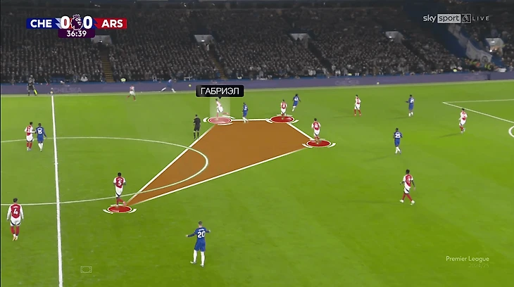 Второй аспект смелости – игра «Арсенала» без мяча. Варьировали режим, но гораздо чаще прессинговали. В этой стадии была интересная наработка: Габриэл в роли дополнительного опорника. Поднимался к Мало Гюсто и формировал квадрат, которым зеркалили квадрат «Челси».