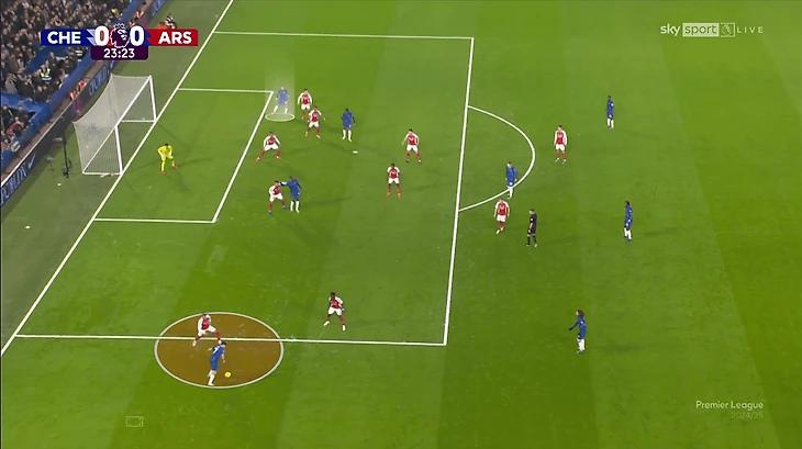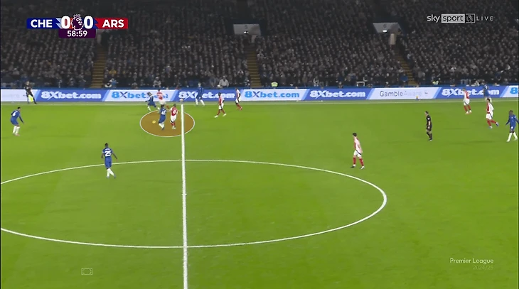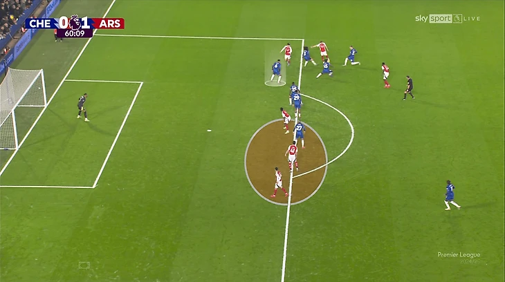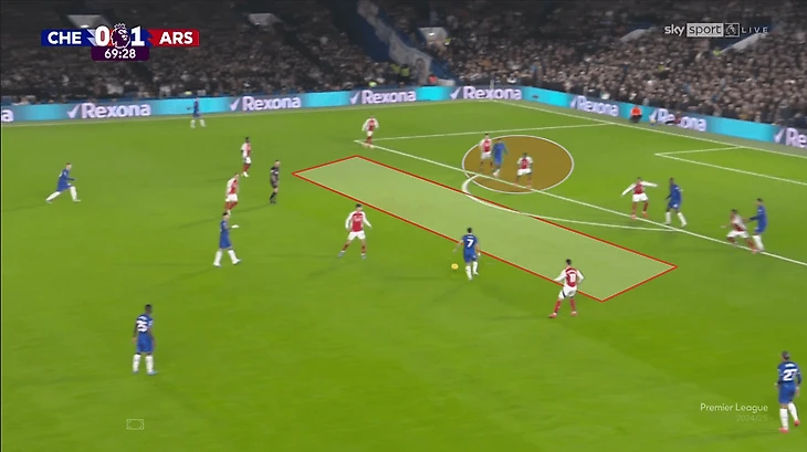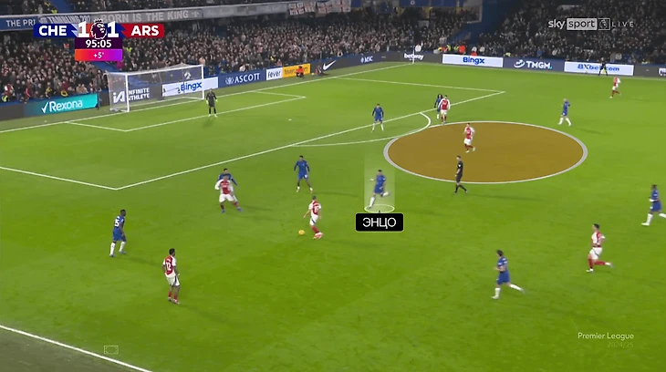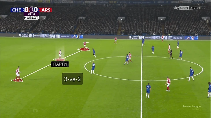 Одна из вспомогательных идей – оттяжки Томаса Парти, Деклана Райса (и даже Мартина Эдегора!) в оборону. Затрудняли прессинг для «Челси», хотя к остроте таких розыгрышей вопросы все же есть (владение направлено на контроль, а не на обострение).