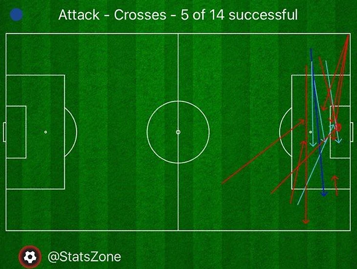 Почти всю остроту «Челси» создавал после кроссов в штрафную. Не делали из них ставку, но когда выводили партнера в позицию для навеса, здорово распоряжались моментами. Вот показательная табличка. В общей сложности только 14 кроссов, но сразу 5 доставлено до партнеров. В четырех случаях приводило к удару.