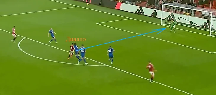 На 17й минуте «Лестер» подавал угловой и простой вынос обернулся потенциальными неприятностями для лис. Ошибся Кристиансен, не ставший играть высокий мяч до касания круглого о газон. Этим воспользовался шустрый Диалло, совершил перехват и помчал к воротам. Виктор сам исправил свою ошибку, не без труда выбив мяч в аут.