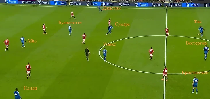 Стив Купер в свою очередь сделал сразу 3 перестановки. На острие место Варди (травма спины) занял Айю, вместо Перейры справа в защите вышел Джастин. Видимо, тренер остался недоволен игрой Мавидиди в прошлом туре и не стал его даже на замену на Олд Траффорд выпускать. На его место слева в атаке переместился Фатаву и команда вышла без ярко выраженного атакующего игрока на правом фланге. Скорее в полуфланге расположились Буананотте и Сумаре под ним.