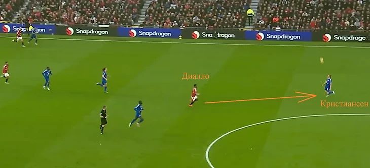 Тайм шел к завершению. Снова стандарт у ворот «МЮ», снова вынос и снова ошибается Кристиансен. Теперь мяч он принял, спокойно отыграл на вратаря, получил обратно. Но, поторопившись, выбил, не глядя, вперёд (видимо, ждал свистка на перерыв после выноса). Мяч полетел прямиком на Каземиро, который в касание отправил в прорыв Диалло.
