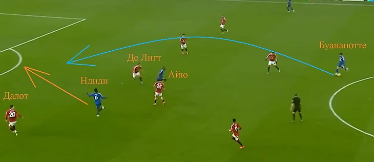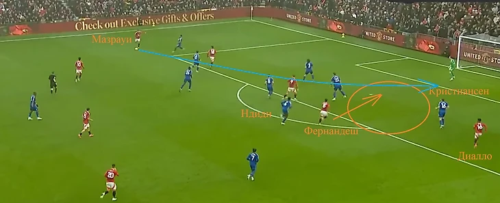 Мазрауи увидел рывок португальца и сделал изумительный навес. Фернандеш им толком воспользоваться не смог, но мяч угодил в бедолагу Кристиансена, который прибежал тушить «пожар», и запрыгнул в ворота. Вины Виктора в его автоголе нет, он в момент подачи играл по Диалло, а вот Ндиди рывок капитана «МЮ» проспал.