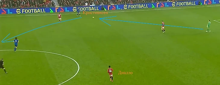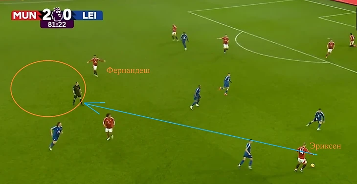На 75й минуте Хойлунд покинул поле, вышел Зиркзее, а на 79й минуте Эриксен вышел вместо Каземиро (который получил небольшое повреждение, судя по трансляции). И тут же на 82й минуте опытный датчанин сделал гол, находясь глубоко на своей половине поля. Посмотрите, из какого положения он сделал передачу на Фернандеша, после которой португалец бежал без сопротивления почти до самой штрафной.