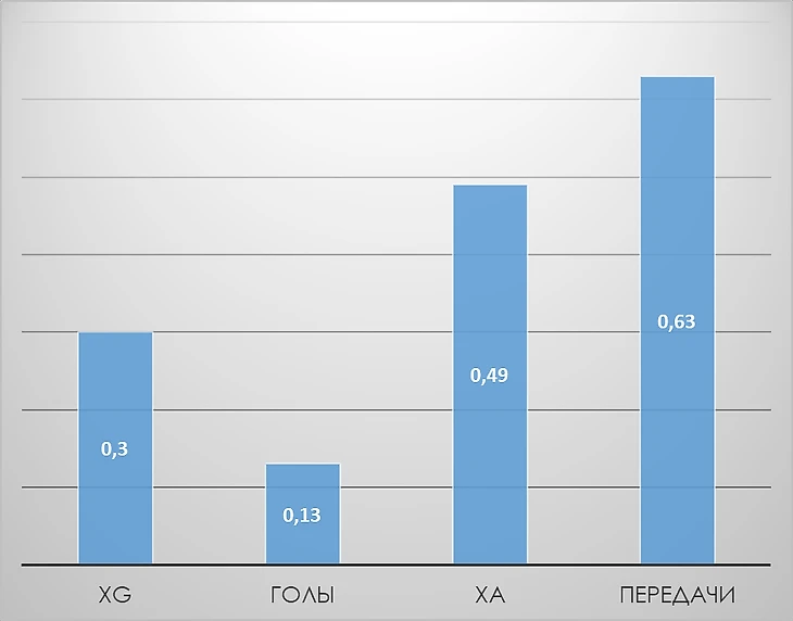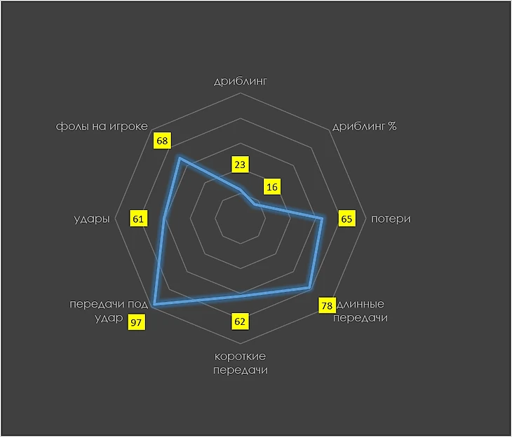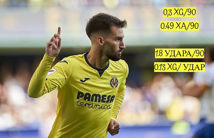 «Вильярреал» провел 12 игр в нынешнем сезоне, преимущественно по схеме 4-4-2, где игрок исполнял роль левого полузащитника. Показатели игрока будем рассматривать посредством диаграмм и графиков, где показатель 60, будет означать, что игрок лучше 60% футболистов на этой позиции. Выборка состоит из 30 лучших полузащитников проведших не менее 10 игр в нынешнем сезоне.