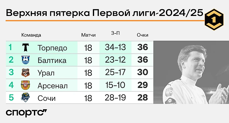 Наверху уже выделились два явных фаворита на выход в РПЛ – это «Торпедо» и «Балтика», которые оторвались на шесть очков. «Урал», «Арсенал» и «Сочи» пока в погоне, но без серьезных ошибок конкурентов на прямые путевки рассчитывать не приходится.