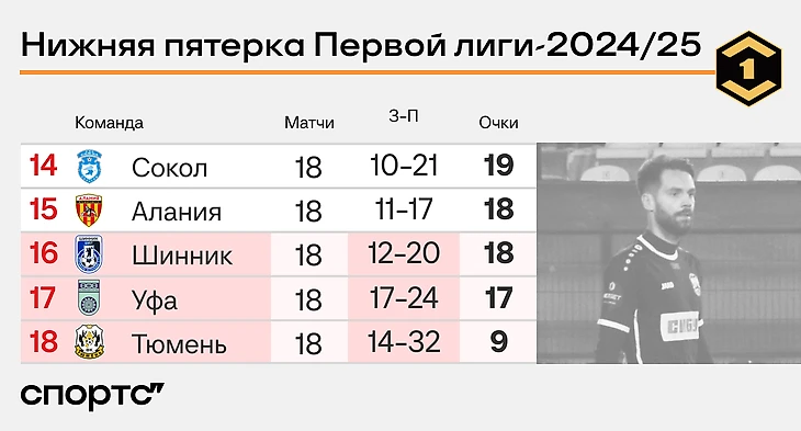 «Тюмень». Всего девять очков за 18 туров: лишь две победы и 13 поражений (из них пять – разгромные). Тут уже все понятно – весну можно потратить на подготовку ко Второй лиге.