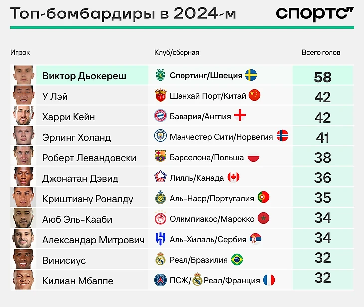 Виктор Дьокереш в большом отрыве неофициальной гонки бомбардиров года. Любопытно, что в 2023-м Криштиану Роналду хватило 53 мячей, чтобы ее выиграть.