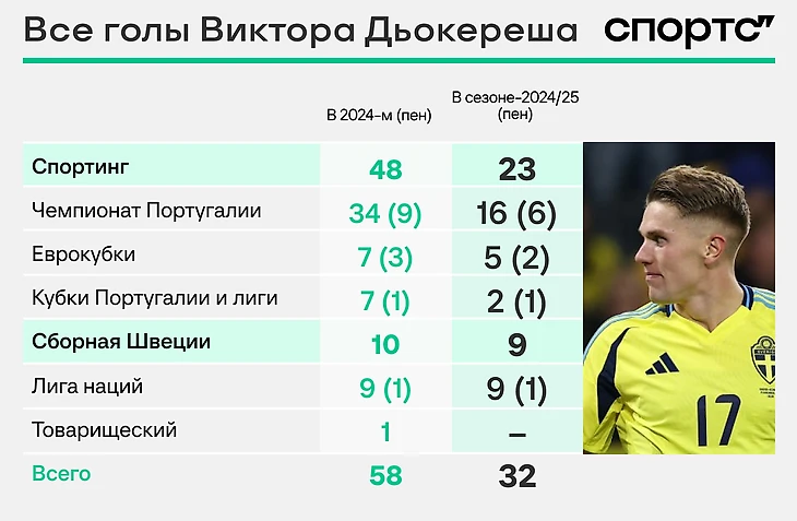 ● 32 гола и восемь ассистов в 24 матчах сезона за клуб и сборную. 10 из них именно за Швецию всего в шести матчах: только в одном не забил, только его шведы и не выиграли (2:2) со Словакией.