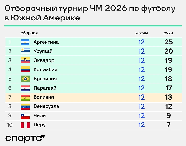 Если текущий порядок команд сохранится, то прямые путевки на ЧМ-2026 получат Аргентина, Уругвай, Эквадор, Колумбия, Бразилия и Парагвай, Боливия сыграет в стыковых матчах.