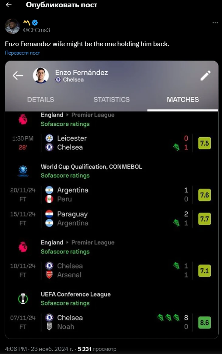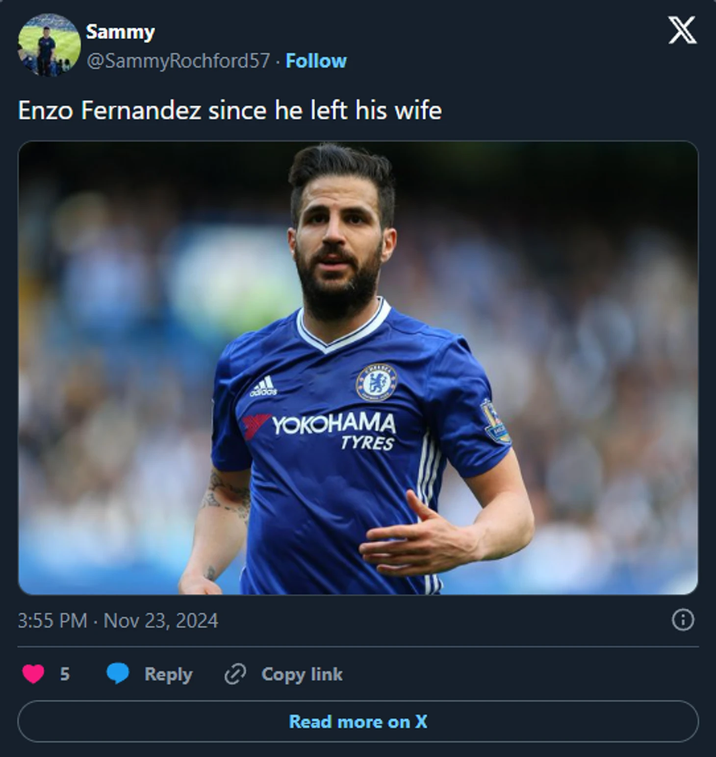 Болельщики «Челси» после игры с «Лестером» предположили, что жена Энцо, с которой футболист недавно разошелся, была причиной слабой игры.