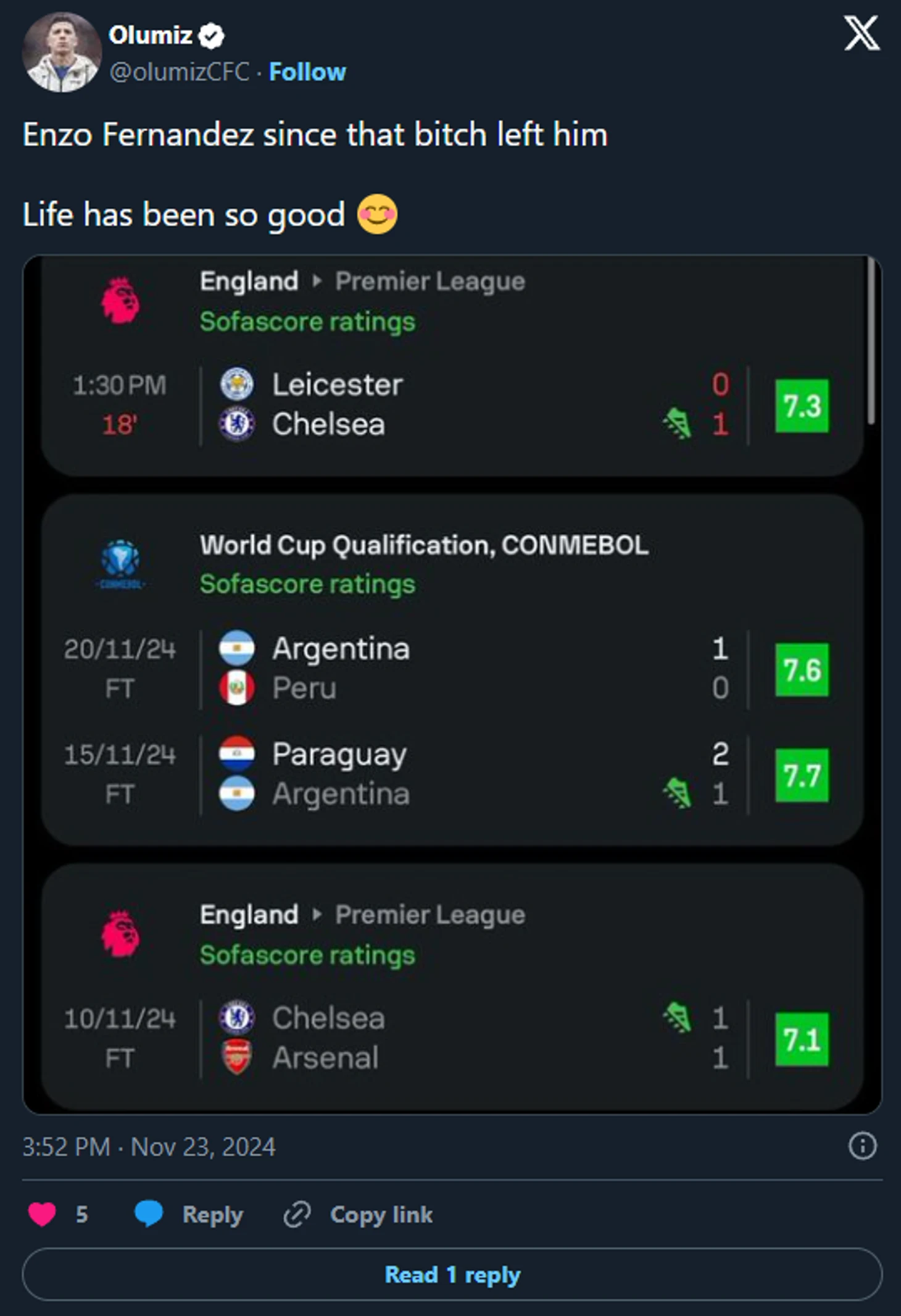 😐 «Бросил эту сучку и превратился в Лэмпарда»: фаны «Челси» связывают хорошую игру Энцо с расставанием с женой
