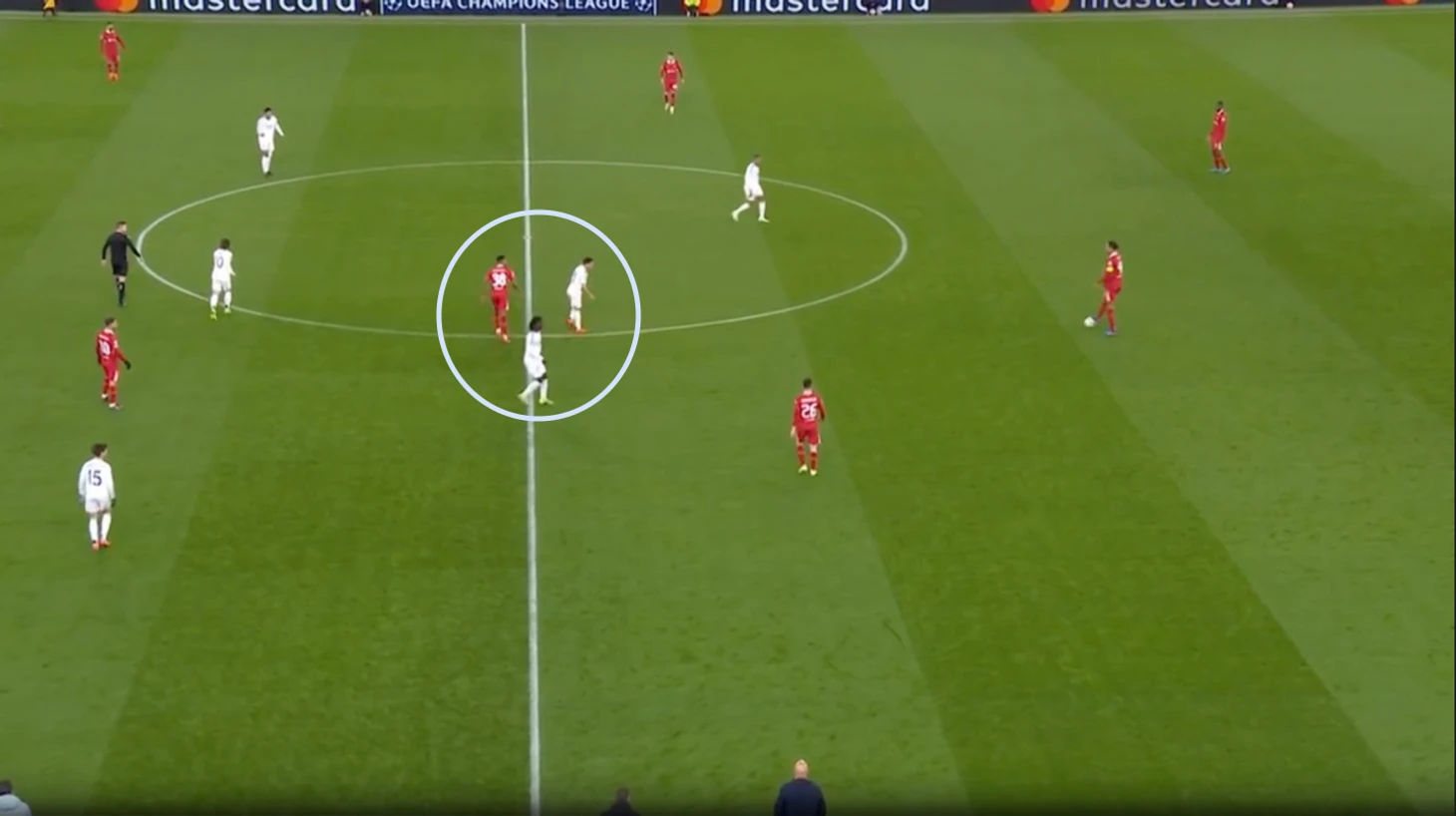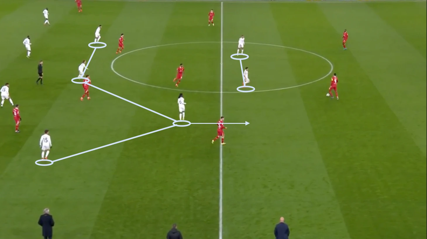 В ответ на это «Реал» начал, в большей степени, встречать соперника в среднем блоке. Гюлер уже располагался в одной линии с Камавингой, Модричем и Беллингемом.