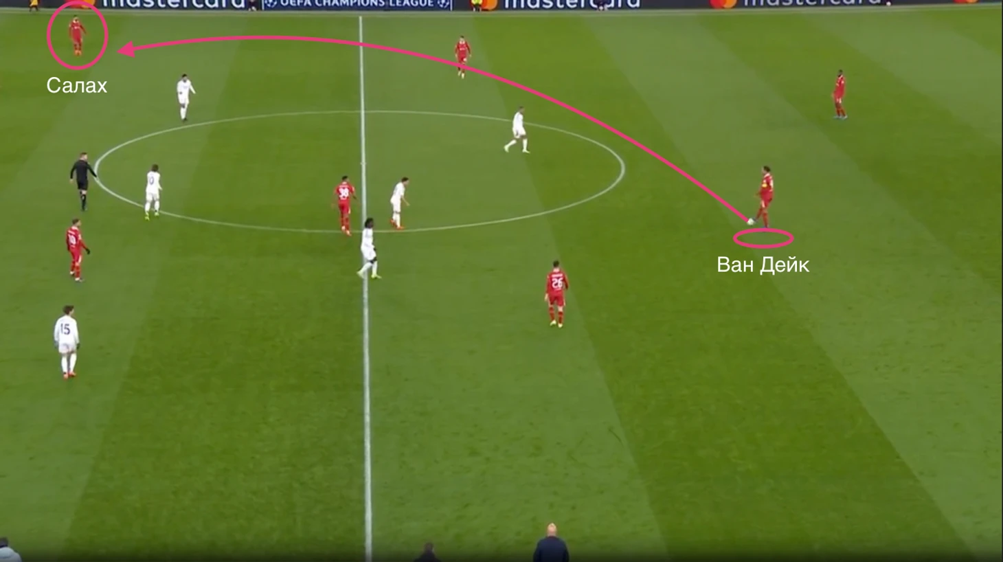 Если Гравенберха перекрывали в центре, Ван Дейк использовал диагональную передачу на правый фланг Салаха. Это также позволяло «Ливерпулю» преодолевать средний блока «Реала» с переходом в финальную треть.