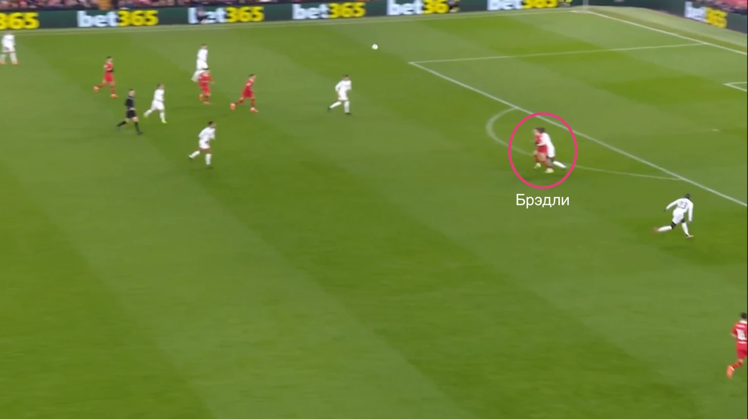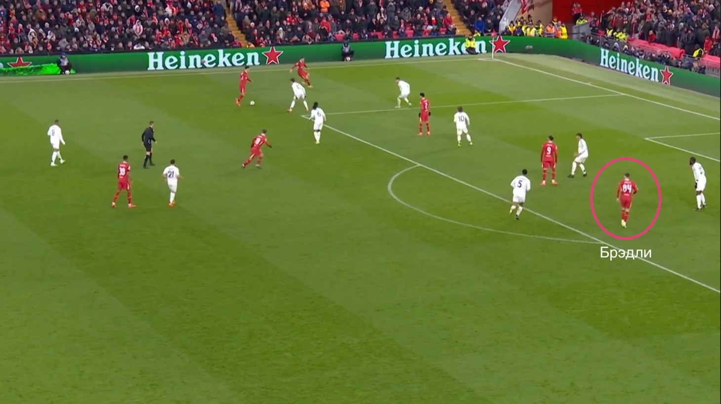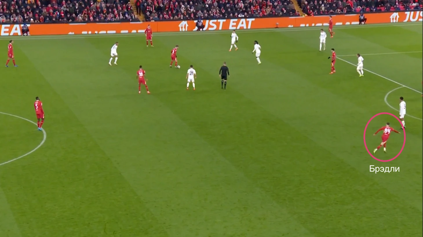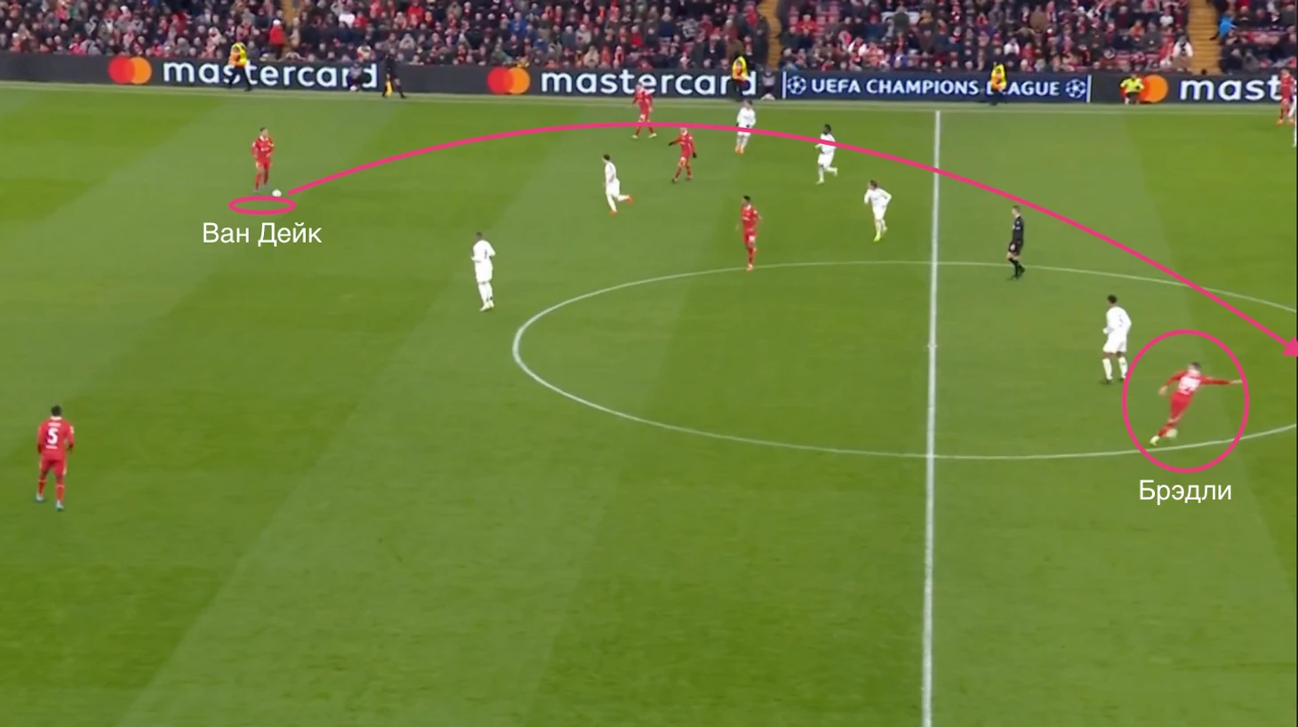 К примеру, Конор делает рывок перед диагональной передачей Ван Дейка на Салаха.