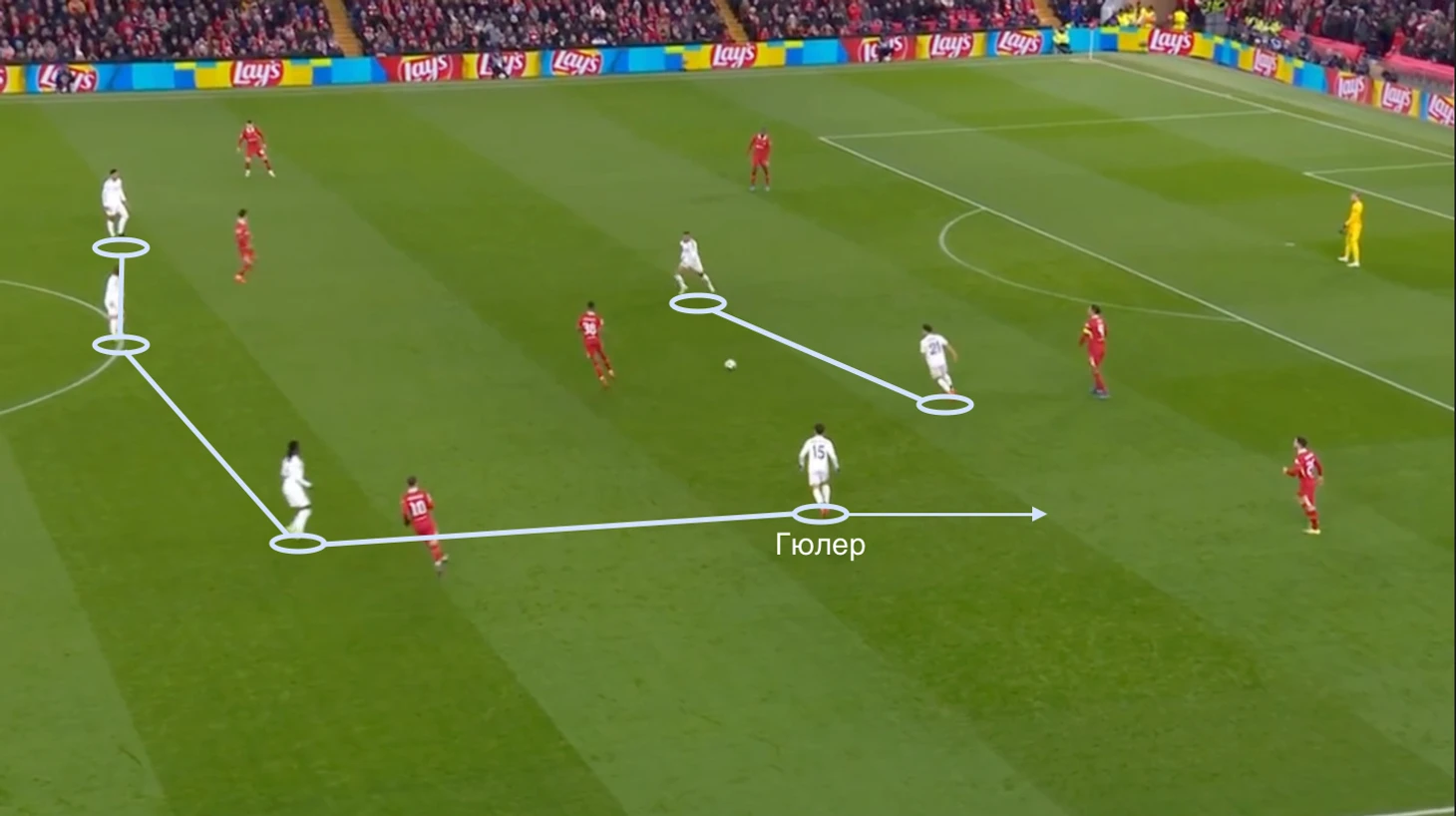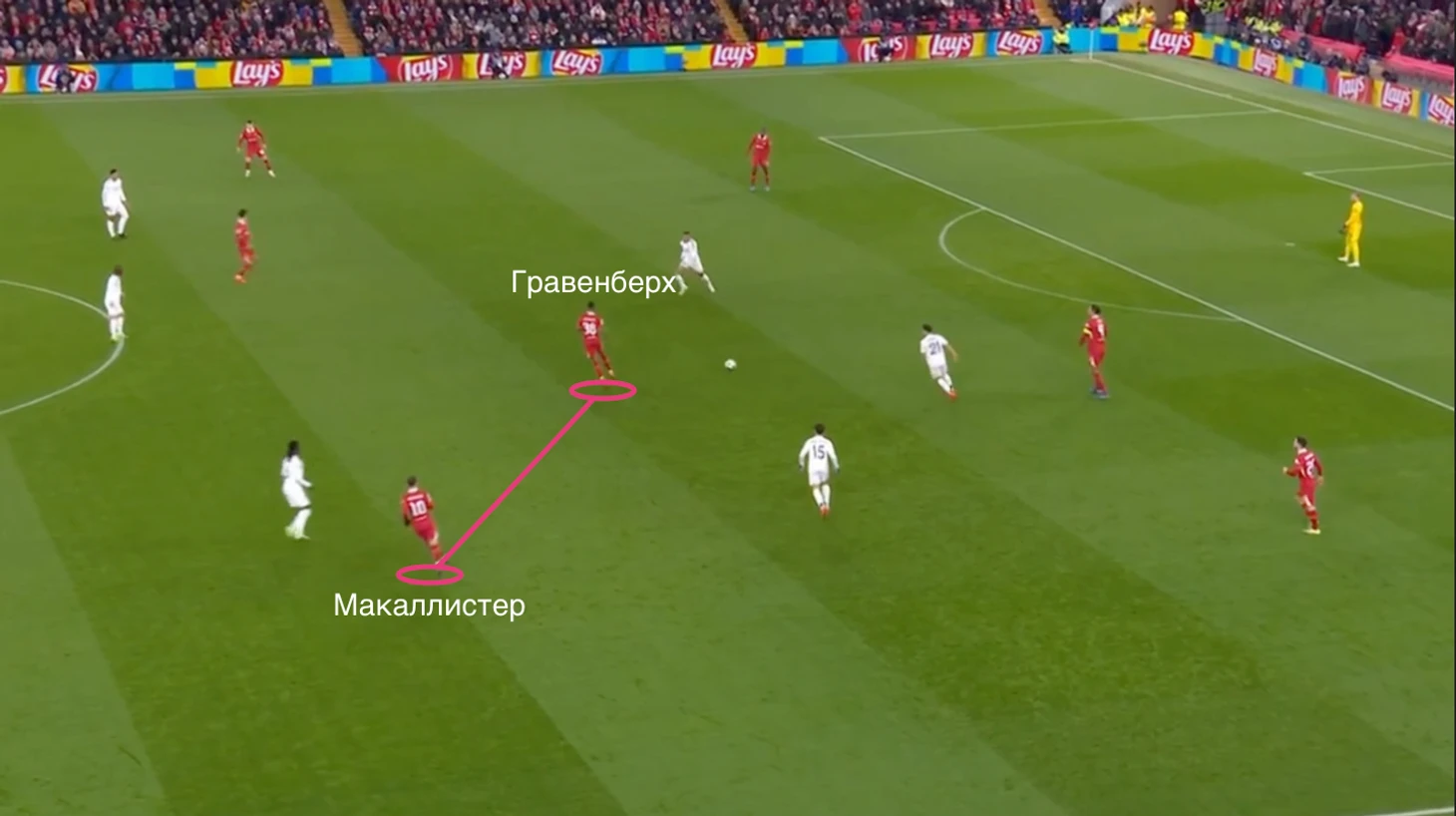 Здесь Ван Дейк находит передачей Мак Аллистера, который через Гравенберха пройдут оборонительный блок соперника и доведут атаку до своего правого фланга.
