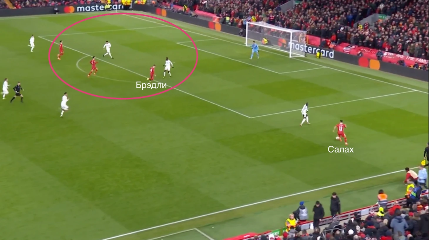 Когда мяч дошел до египтянина, в центре обороны «Реала» за счет включения Конора сложилась ситуация с численным преимуществом 3 в 2 в пользу атаки «Ливерпуля».