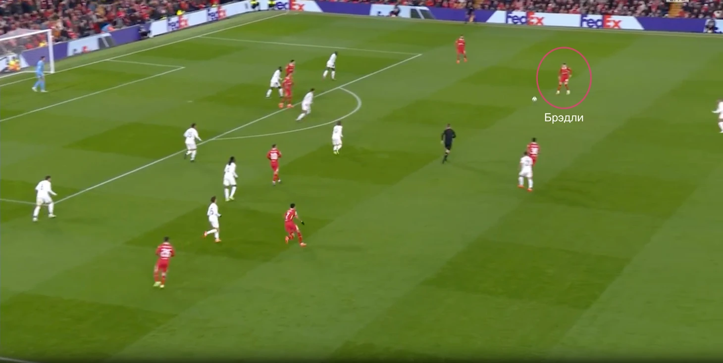 Диагональные развороты стали чаще использоваться во втором тайме, что плавно подводит нас к ключику, который открыл оборону «Реала» – Конор Брэдли.