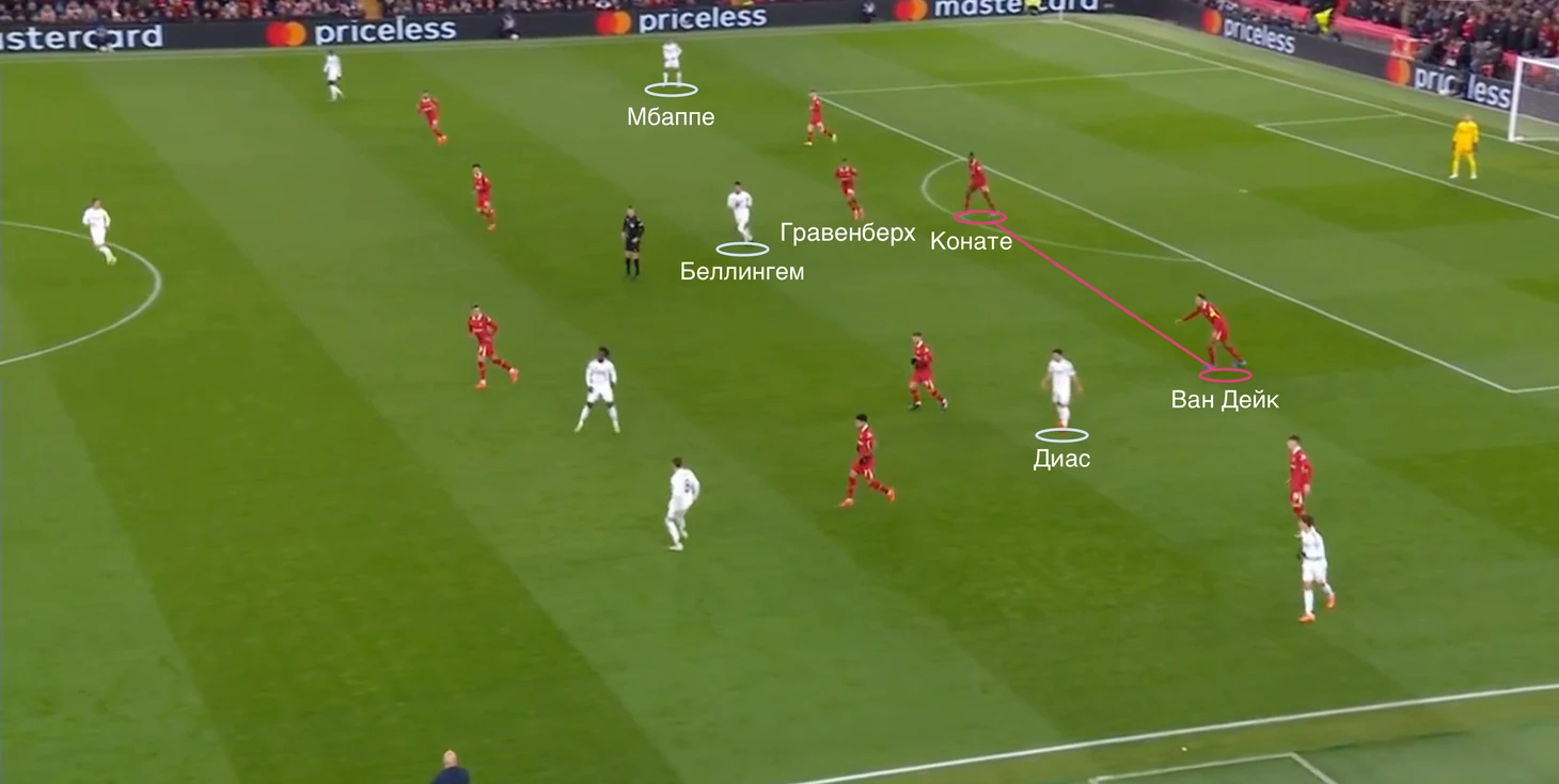 Редкие попытки Беллингема вбегать в штрафную площадь контролировал Гравенберх, от чего Конате и Ван Дейк чувствовали себя спокойно.