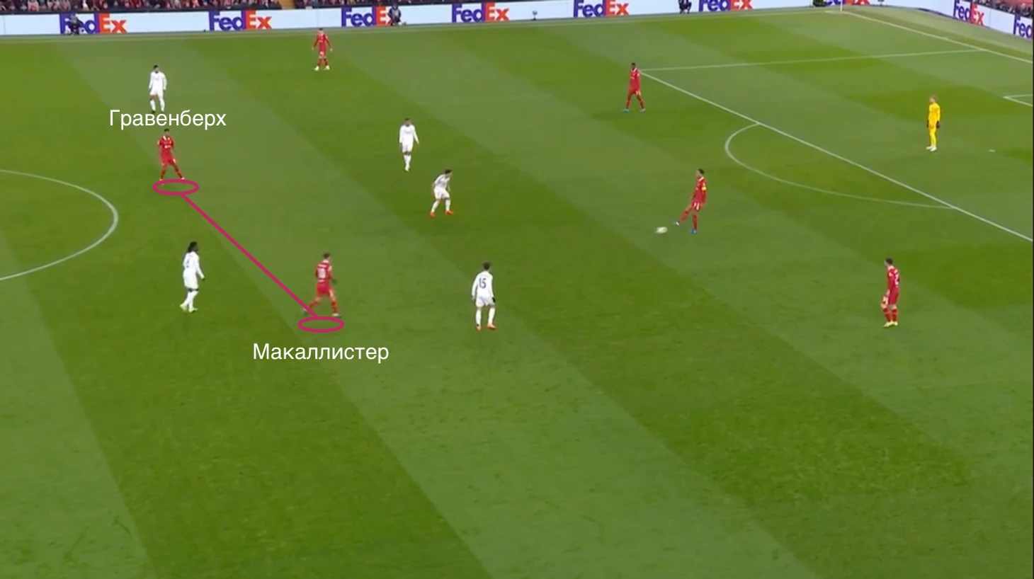 За исключением эпизода с перехватом мяча Гюлером, «Ливерпуль» достаточно комфортно чувствовал себя при таком расположении «Реала». За счет связки Мак Аллистер – Гравенберх, «красные» преодолевали высокий блок «сливочных» и переходили на их половину поля.