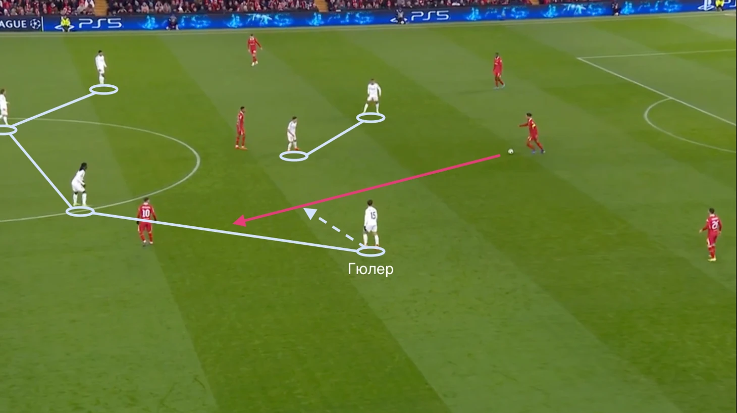 В данном эпизоде уже через свободного Гравенберха «Ливерпуль» преодолевает высокий блок «Реала», продвинув атаку уже до своего левого фланга.