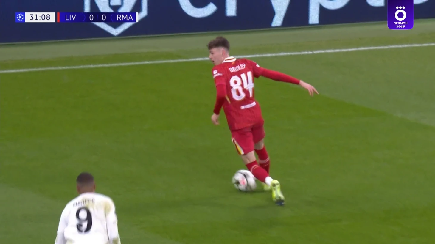 На 32-й минуте Мбаппе улетал в контратаку, Брэдли летел помогать сопровождавшему француза Алексису Мак Аллистеру.