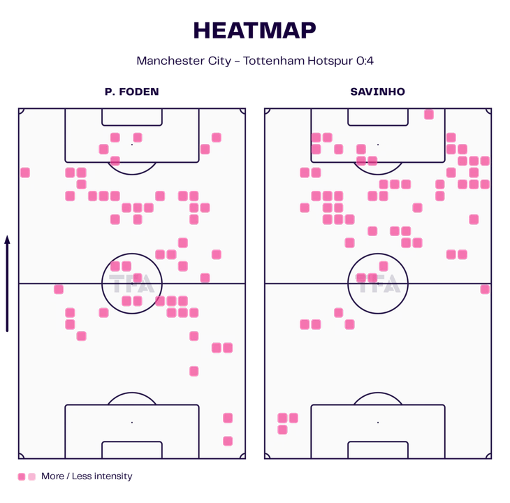 При Гвардиоле Манчестер Сити обычно использовал крайних нападающих, которые смещались внутрь, создавая пространство для фулбеков и облегчая сложные комбинации передач в центральных зонах. Однако в игре с Тоттенхэмом Гвардиола выбрал более узкую атакующую формацию, при этом Фил Фоден и Савио действовали как инвертированные нападающие, позади Эрлинга Холанда.
