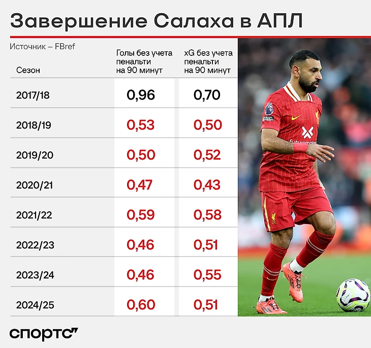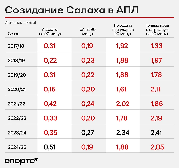С Мо как созидателем есть нюансы. Пока это лучший его сезон в плане ассистов, но по xA, передачам под удар и точным пасам в штрафную он уже не так выделяется.
