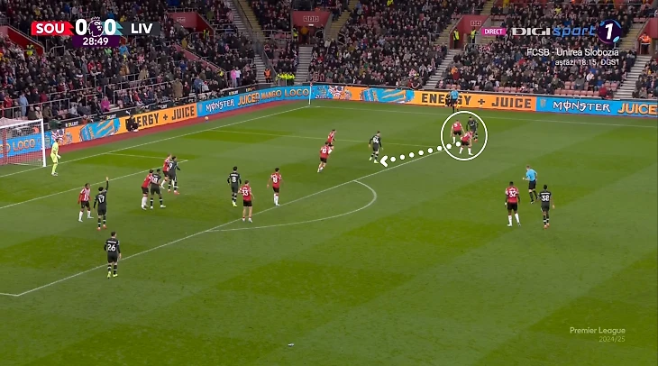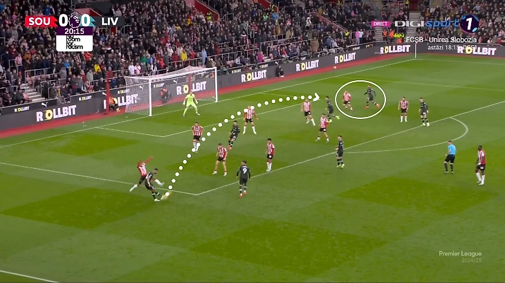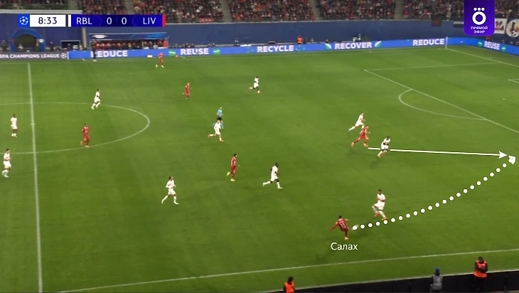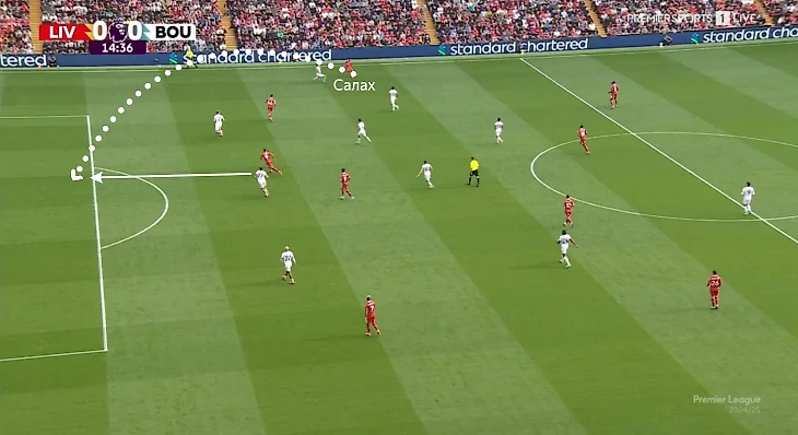 Раньше Мо не так активно двигался туда при атаках слева, но при Слоте просматривается новый тип угрозы. Вот против «Саутгемптона» он открылся за спиной Райана Фрэйзера при кроссе Коди Гакпо. Левый латераль хозяев смотрел на мяч и упустил из виду египтянина (в итоге Салах опасно пробил с угла вратарской).