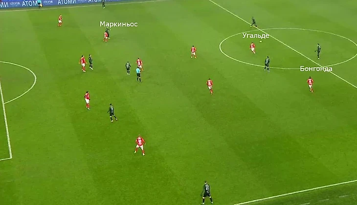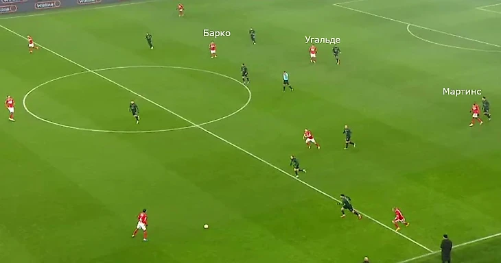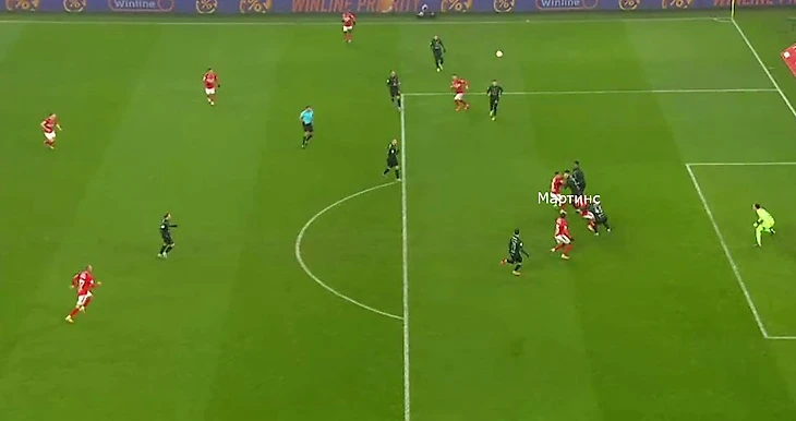 Первое, что могу отметить у игры Спартака, — это активное поднятие восьмёрок на линию нападения, которые широко располагаются друг от друга. Продолжая тему важности центральной линии, также хочу отметить, что Мартинс (в матче с Локомотивом) активно подключается в штрафную, поскольку люксембуржец является одним из высокорослых игроков красно-белых.