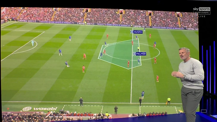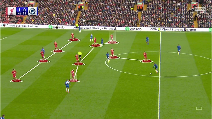 1. Корректировка структуры без мяча. Слот тонко поправляет проблемы в прессинге и в среднем блоке. Вот пример из встречи с «Челси». Джейми Каррагер разбирал этот эпизод в контексте хитрой задумки Энцо Марески, который вот так вскрывал 4-2-4 «Ливерпуля».