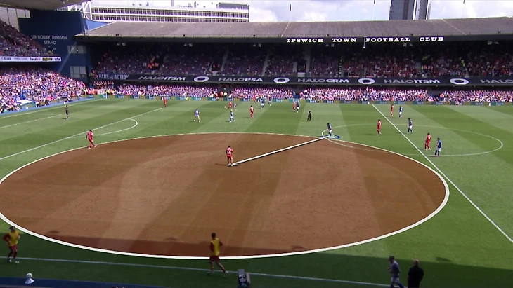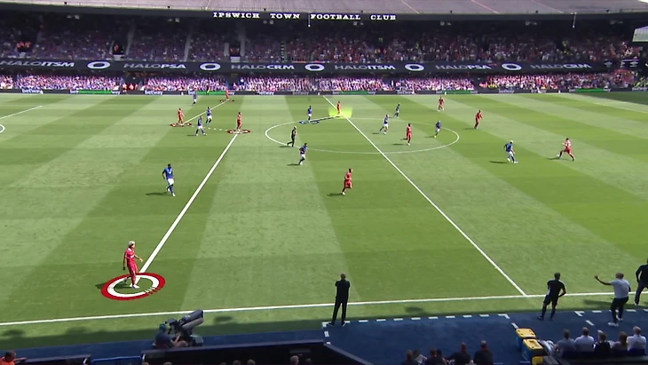 Разберем пример манипуляции через смену зоны крайних защитников против «Ипсвича» – особенно наглядно, так как соперник использовал персональные ориентировки по Тренту и Робертсону. Первый тайм – ТАА в опорной, Робертсон рядом с центральными защитниками. Все в центре – расстояния небольшие; сопернику проще совмещать персональную опеку с поддержанием компактности.
