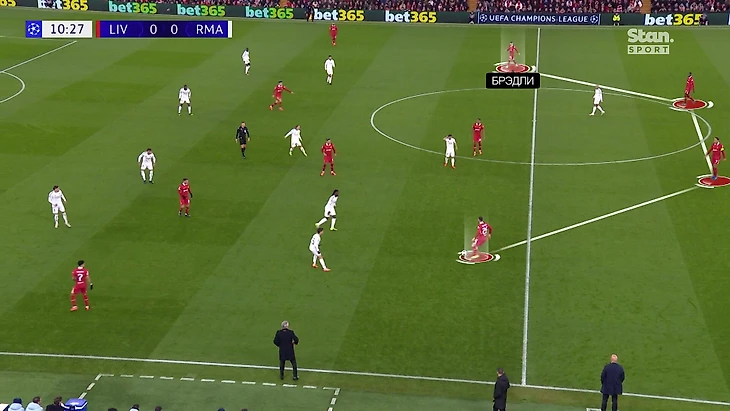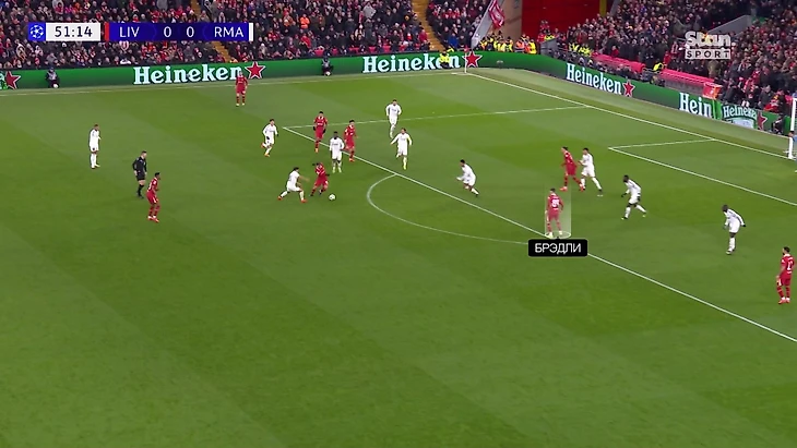 В перерыве Слот посчитал, что против этого приема лучше подходит более широкое расположение крайних защитников. Соперник все еще старался персоналить, но теперь оппоненту Трента пришлось разрываться между задачами – либо играть по ТАА, но бросать 3-в-3 сзади и пустую опорную, либо оставлять его свободным.