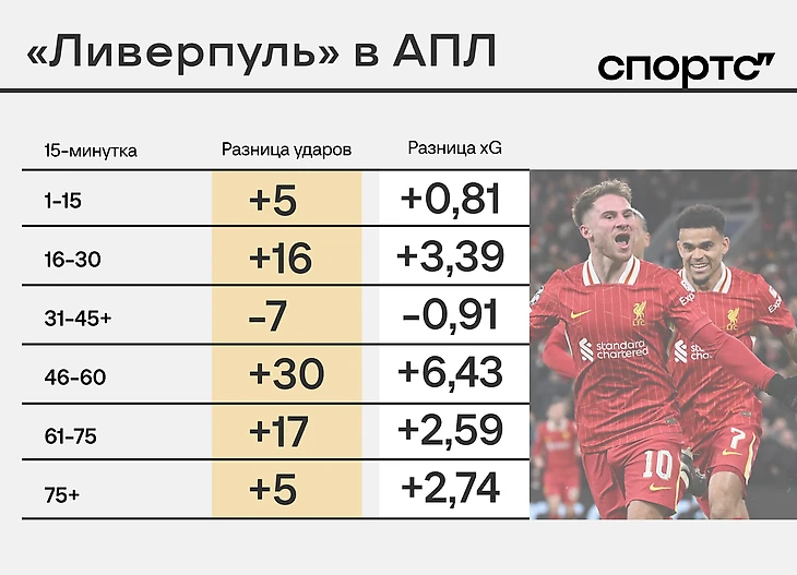 Отдельно нужно фиксировать конкретно отрезок сразу после перерыва. Он у «Ливерпуля» с огромным отрывом самый продуктивный. Так выглядит динамика команды по 15-минуткам: