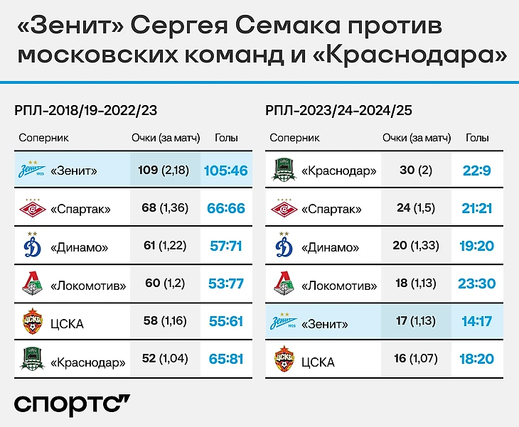 Объясню позицию. Запас прочности «Зенита» снижается с лета 2023-го. Уровень РПЛ падает из-за изоляции и увеличивающегося разрыва между богатыми и бедными клубами. Возможности «Зенита» выделяются даже в сравнении с топами РПЛ: могут удерживать суперзвездный костяк, перестраиваться, усиливать состав каждое трансферное окно. Но команда Сергея Семака уже полтора сезона не доминирует в больших матчах и все чаще мучается против аутсайдеров, которые становятся слабее.