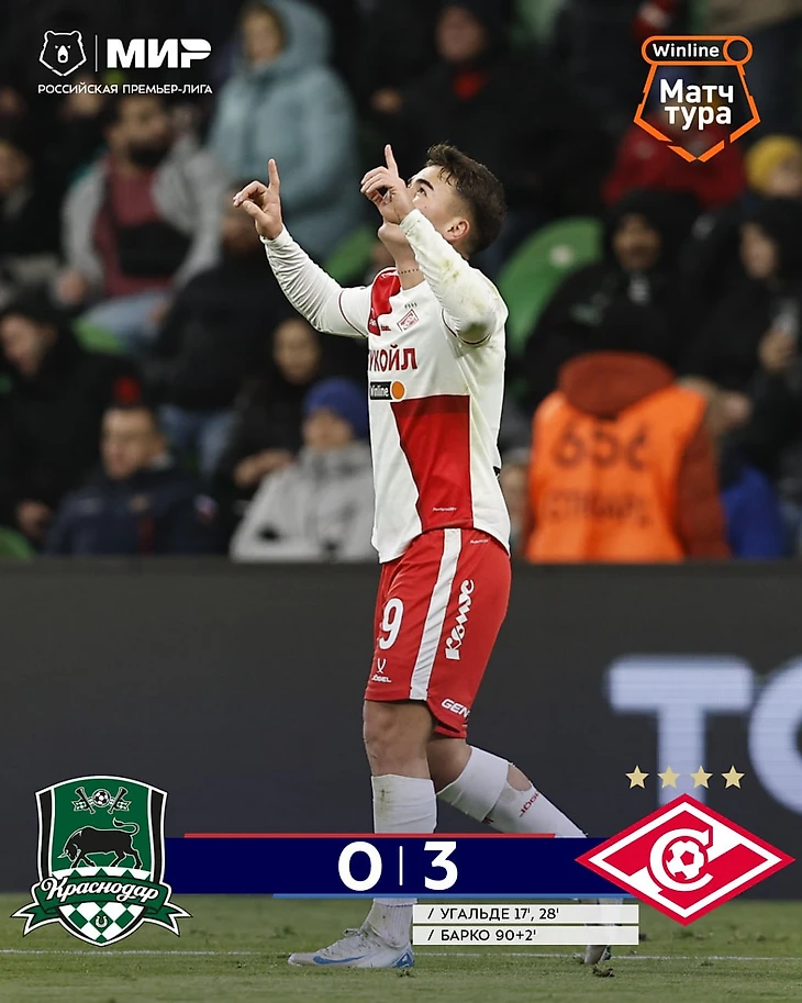 «Спартак» на выезде разгромил «Краснодар» в матче 17-го тура РПЛ — 3:0.
