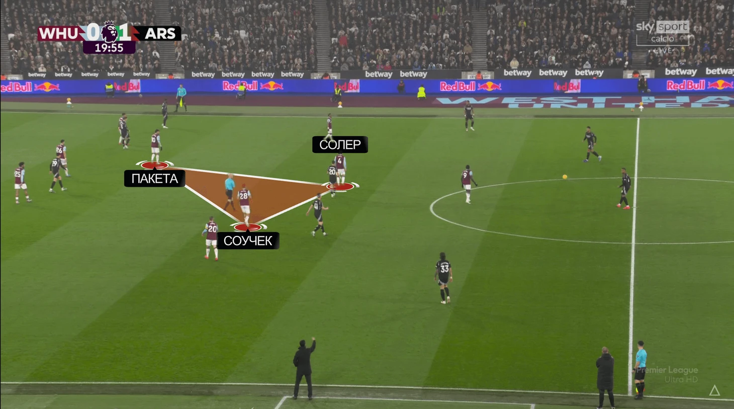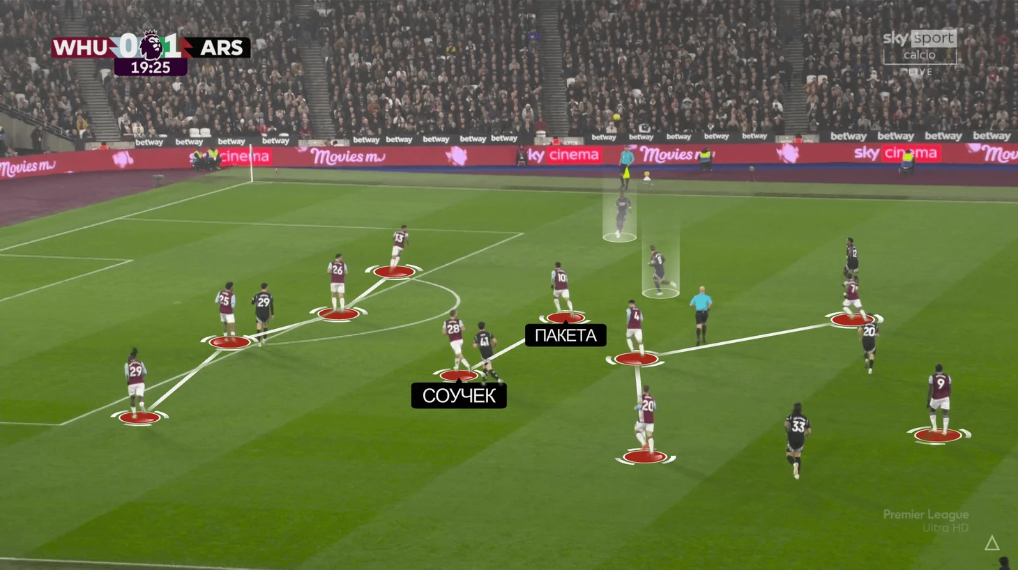 Игра с «Арсеналом» (2:5) – разгром еще одной безумной идеи Лопетеги. В этот раз опорником часто оставался Лукас Пакета – лучший плеймейкер «Вест Хэма». Ниже пример в позиционной защите, но подобное встречалось и в прессинге, когда нужно не только страховать, но и покрывать кучу пространства: