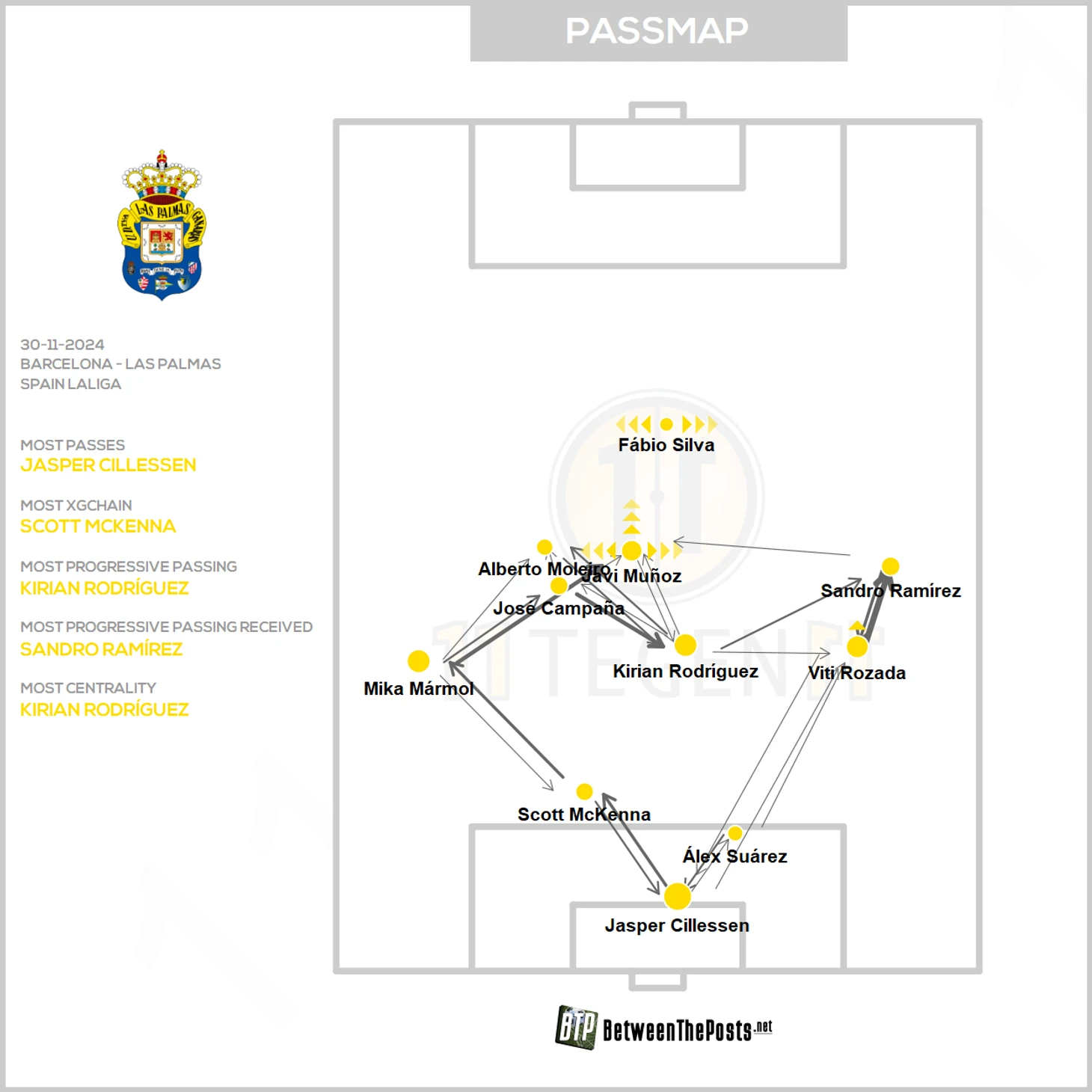 Для команды, которая так мало владела мячом (30%), «Лас-Пальмас» неприлично часто задействовал перепасовки между вратарем и защитниками. Единственная цель – заставить «Барсу» подняться максимально высоко, чтобы потом вскрыть пространство: