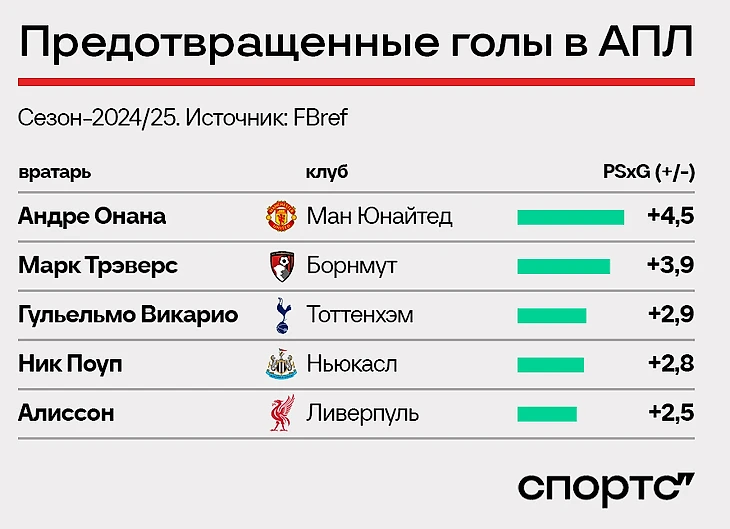Сухие матчи – не всегда индикатор качества вратарской игры, мы уже выясняли, как «Золотую перчатку» Де Хеа в сезоне-2022/23 выиграла оборона «Юнайтед». Случай Андре иной, прямо сейчас он лучший вратарь АПЛ по игре на линии. Обратимся к метрике предотвращенных голов PSxG (+/-) – она учитывает больше критериев, чем просто разница ожидаемых и реально пропущенных: качество удара (позицию, угол, количество защитников на линии) и фактический результат (был ли гол). Чем больше PSxG, тем выше вероятность гола.