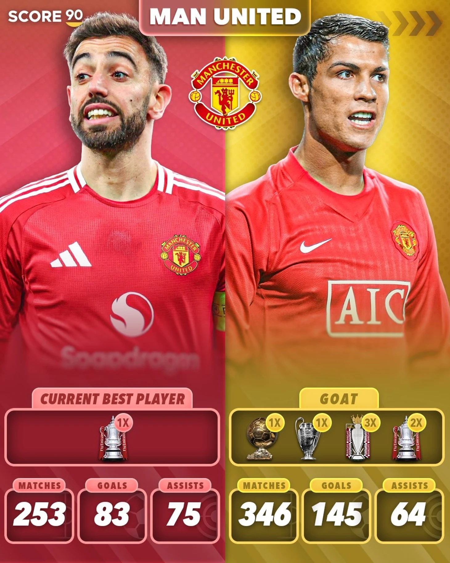 Лучшим нынешним игроком «красных дьяволов» назван Бруну Фернандеш, а величайшим – Криштиану Роналду. Криро обходит соотечественника по всем параметрам, кроме ассистов, в копилке Бруну на 11 голевых передач больше.