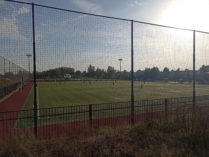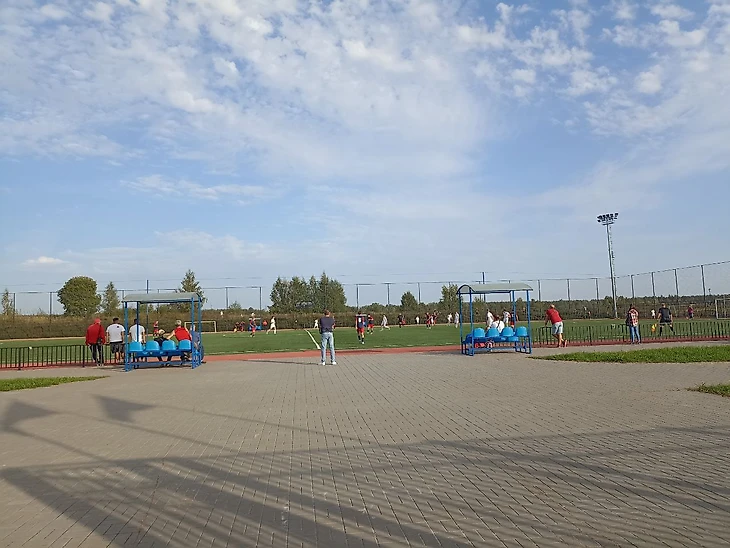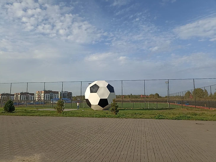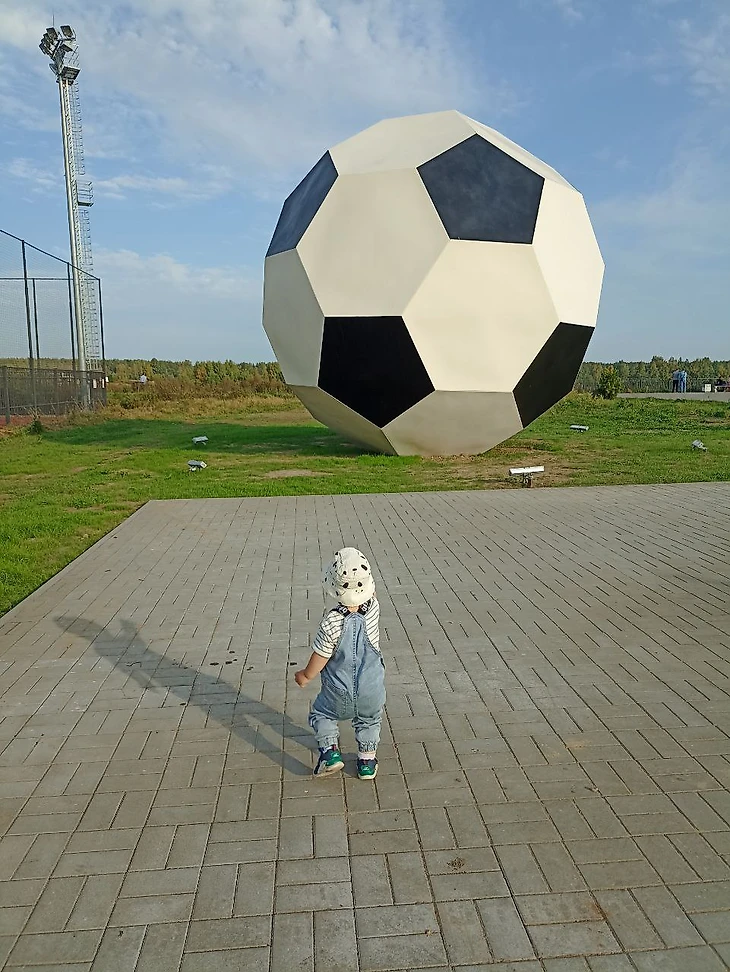 Поляна типовая, с искусственным покрытием. Есть трибуны в три ряда человек на 200 и возможность свободно прогуляться вокруг поля. Мы посмотрели минут 20, покушали с видом на игру с первого ряда и пошли гулять вокруг поля, смотря при этом матч. Рядом с полем стоит большой футбольный мяч, который очень понравился сыну.