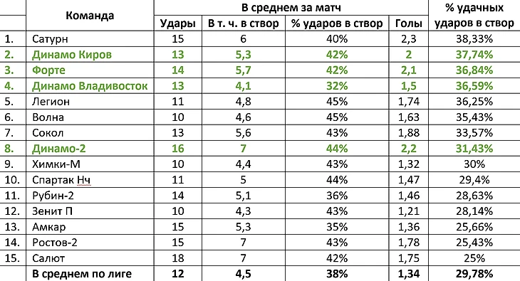 А вот если брать эффективность ударов в створ (процент результативных ударов в створ от количества ударов в створ), то здесь картина несколько иная. Лига такую статистику не предоставляет, поэтому рейтинг, который вы видите – не по лиге, а по выборке команд. В нее включены победители групп, сильнейшие соперники «Сокола» по группе 4, команды с наибольшим процентом ударов в створ ворот и самая результативная команда лиги. Зеленым выделены победители групп.