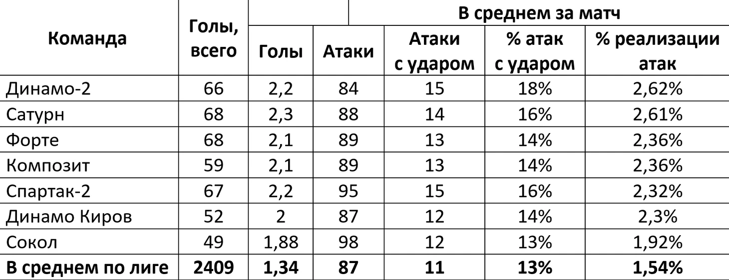 Выводы, приведенные в предыдущем абзаце, косвенно подтверждаются и таким критерием, как количество атак в среднем за матч. У «Сокола» этот показатель – лучший в лиге наряду с «Севастополем» – 98, но наша команда стоит выше, поскольку чаще завершала атаки ударами по воротам – 12 раз, или 13% атак (у крымчан – 11 раз или 12%). В то же время, у команд, которые в среднем за матч забили больше, чем «Сокол», процент атак, получивших логическое завершение в виде удара по воротам, выше. И процент реализации атак тоже, естественно, выше.
