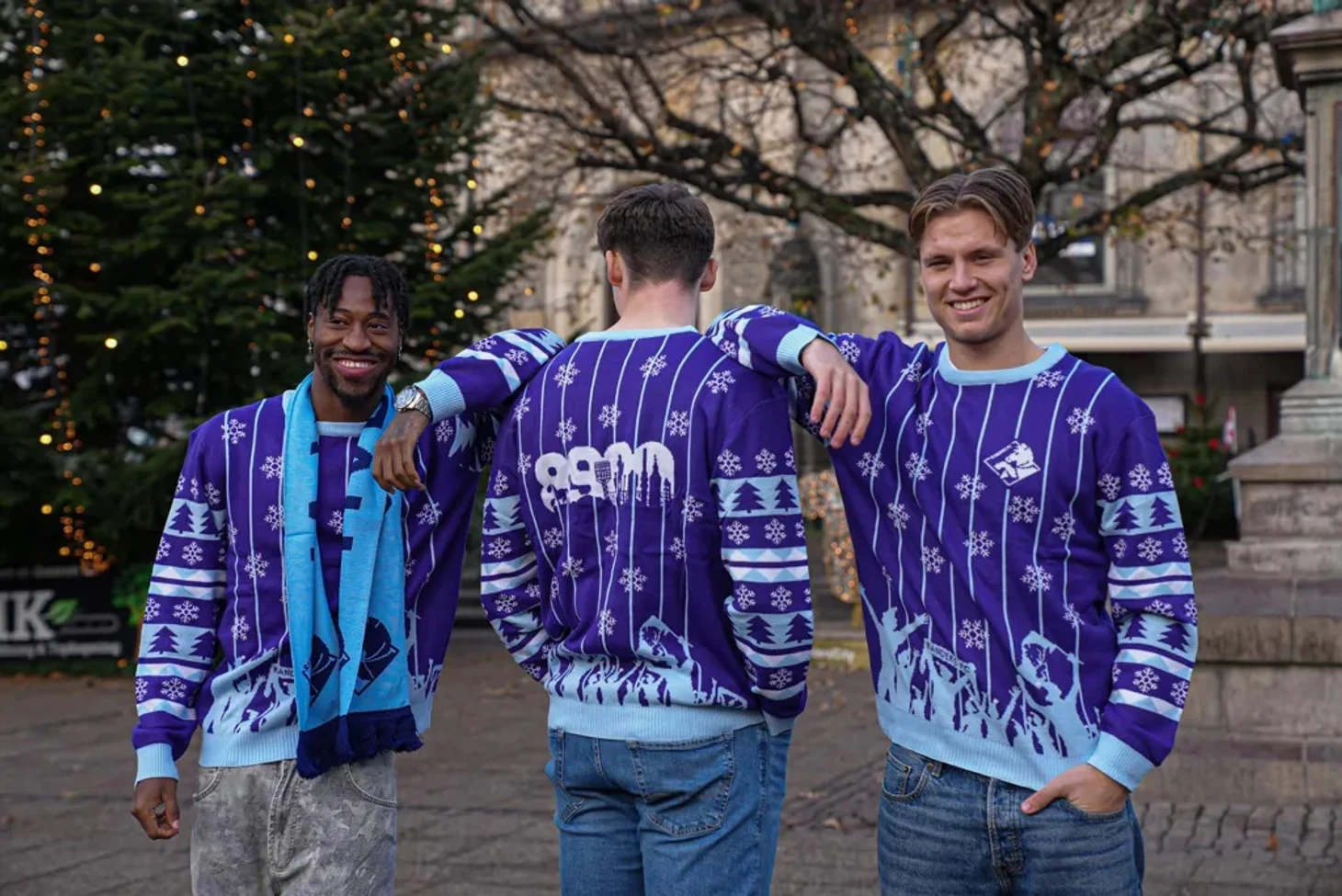 Рождественский свитер футбольного клуба «Раннерс» — это дань уважения болельщикам, сообществу и городу. Есть снежинки, елочки и счастливые болельщики. Кроме того, на груди также можно найти логотип клуба.