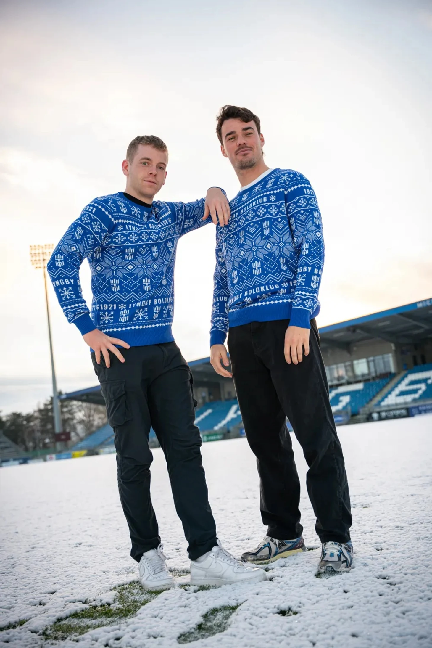 Рождественский свитер «Люнгбю» с новой эмблемой клуба. Кроме того, можно увидеть 1921 год, когда был основан клуб. А еще есть и пуансеттии (цветок), и снежинки.